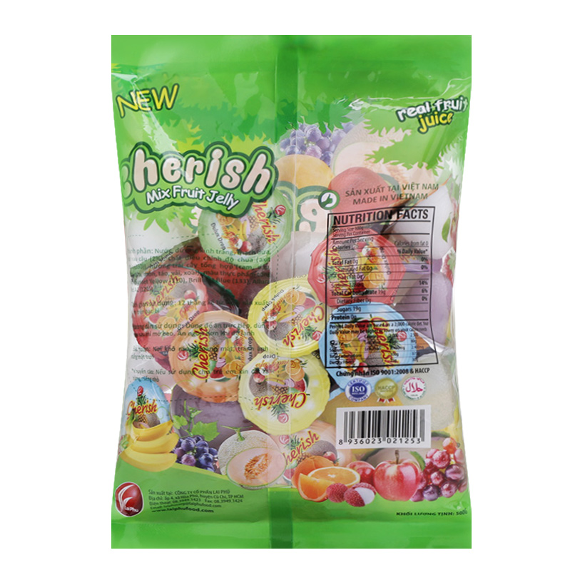 Ingredients: Water, white sugar, coconut jelly, vegetable powder (2%), citrus acid (330), citrus fruit, Mango, food coloring (Sunset Yellow (110), Brilliant Blue (133), Allura Red AC (129))